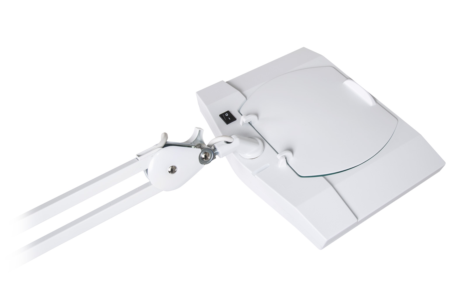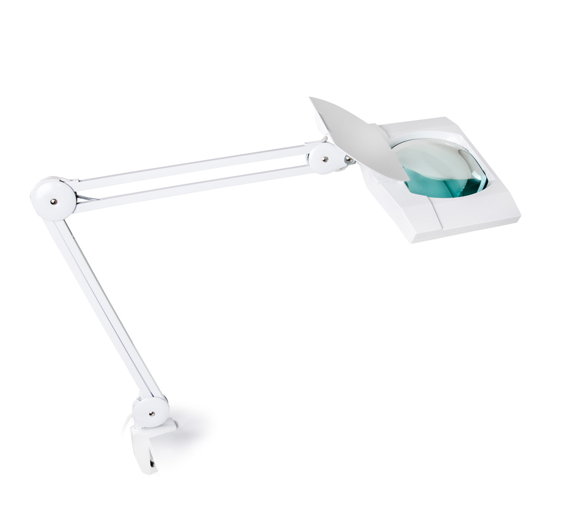 Lupa s úsporným LED osvetlením s veľkým obdĺžnikovým zväčšovacím sklom s rozmermi 19 x 16 cm a optickou silou 8 dioptrií - t. j. zväčšenie. Šošovka lampy je vyrobená z kvalitného skla, nie z menej odolných a menej stabilných plastov. Osvetlenie lampy zabezpečuje dvojica vysoko svietivých modulov LED, každý s 10 výkonnými diódami LED. Na rozdiel od bežného variantu so žiarivkami toto riešenie ponúka výraznú úsporu nákladov na elektrickú energiu aj na výmenu trubíc. LED diódy majú výrazne dlhšiu životnosť. Celková spotreba energie svietidla je len 10 W. O držanie lampy sa stará robustný dvojramenný kĺbový polohovací mechanizmus, ktorý umožňuje nastaviť lampu do požadovanej polohy bez nutnosti doťahovania poistných skrutiek. Keď sa svietidlo dostane do požadovanej polohy, zostane v nej. Rameno lampy je celokovové. Rameno lampy možno pripevniť k doske stola pomocou malého zveráka, ktorý sa pripevní k okraju stola. Lampa je vybavená aj ochranným sklopným krytom, ktorý zabraňuje usadzovaniu prachu na povrchu optiky, keď sa nepoužíva Lampa s lupou nájde uplatnenie najmä pri opravách elektroniky - spájkovanie dosiek plošných spojov pod lupou, na vyhľadávanie chýb, na kontrolu kvality materiálov, na defektoskopiu, na opravu hodiniek a šperkov atď.
