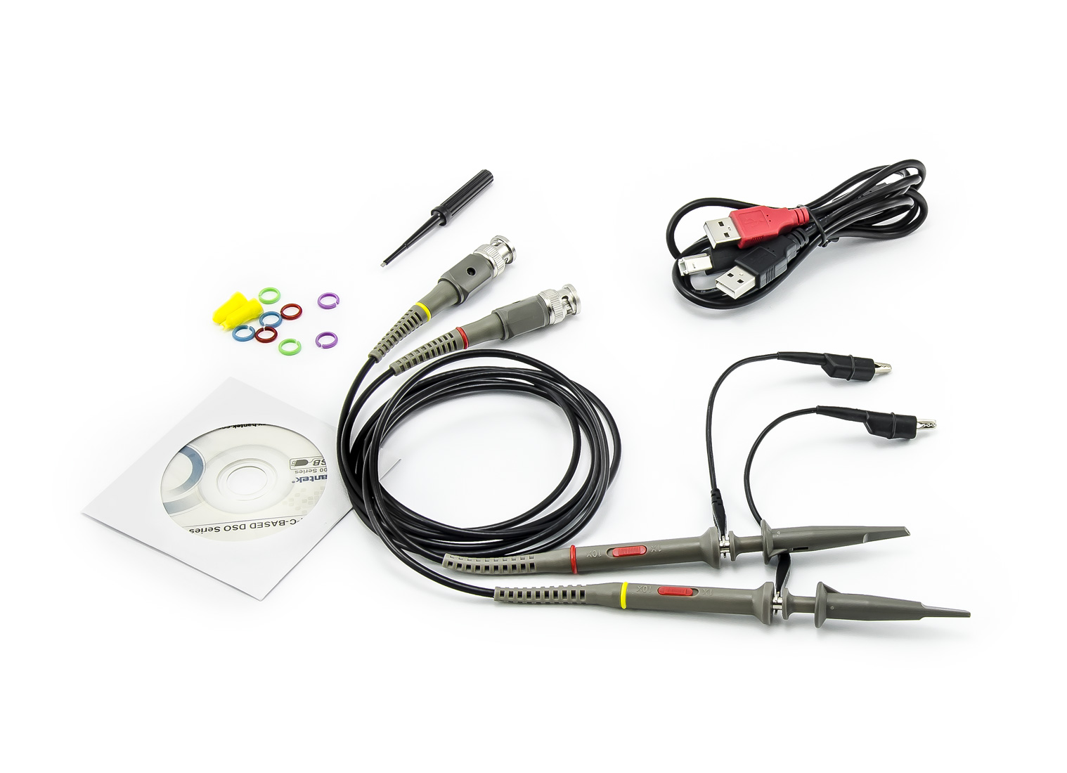 Súčasťou balenia sú: 2x 20MHz meracie sondy, nástroj na ovládanie korekčných trimrov, farebné krúžky na označenie sond, USB kábel.