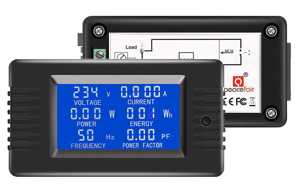 LCD displej 50x30 mm s modrým podsvietením zobrazuje súčasne napätie, prúd, frekvenciu, aktuálnu a celkovú spotrebu a účinník