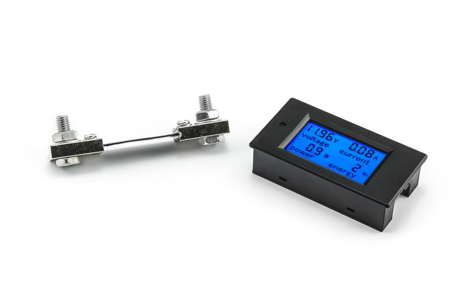 Panelový multimeter PZEM-051 merajúci jednosmerné napätie, prúd, výkon a spotrebu s veľkým modro podsvieteným displejom 6,5 V - 100 V DC, 100 A, 10 kW.