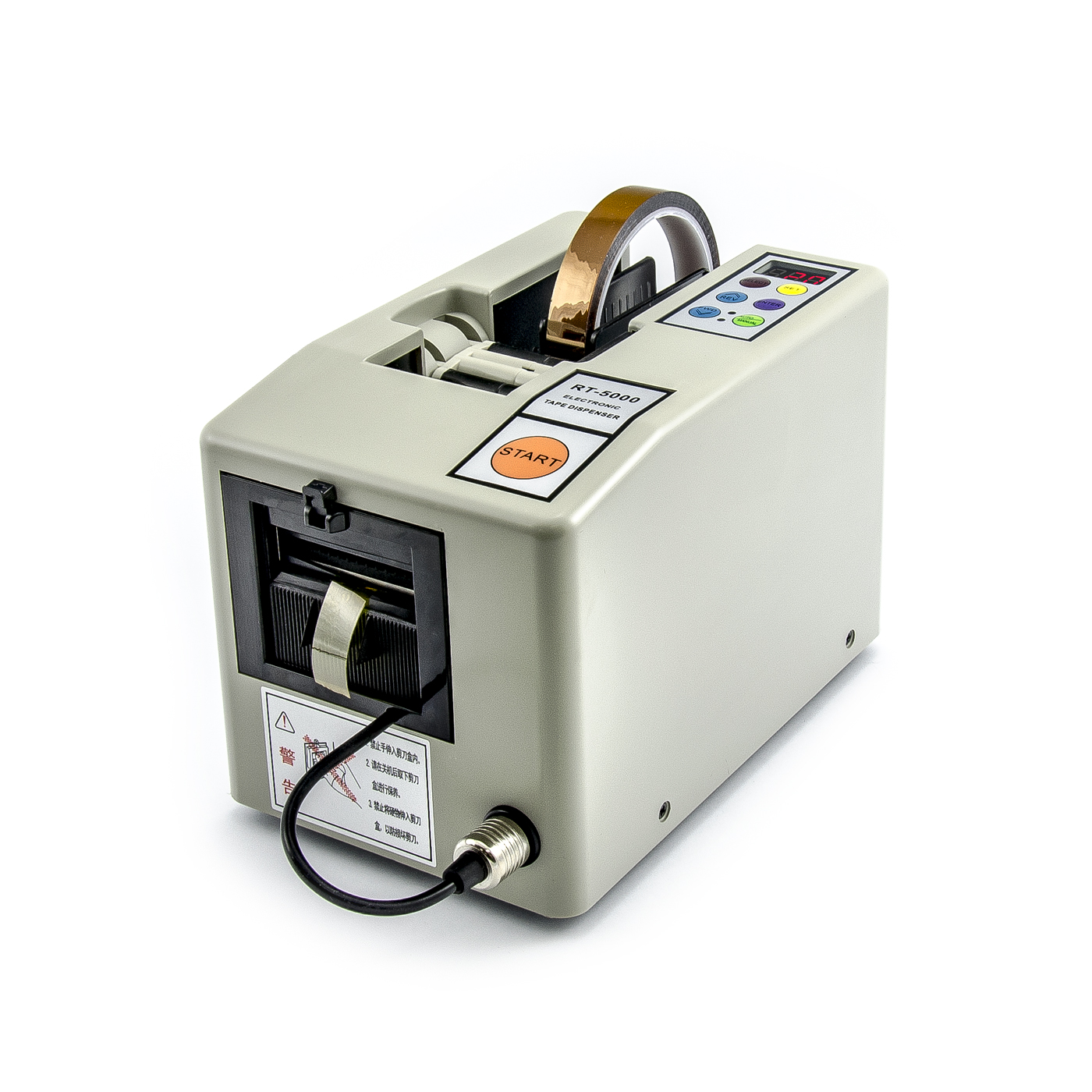 Automatický programovateľný dávkovač lepiacich a nelepiacich pások RT-5000 s nastaviteľnou dĺžkou rezu od 5 mm do 999 mm a možnosťou nastavenia až troch makier s rôznymi dĺžkami rezaných pások, ktoré možno dávkovať v opakujúcich sa sériách. Dávkovanie je možné vykonávať v niekoľkých režimoch. V automatickom režime možno dávkovať buď jednu pevne stanovenú veľkosť, alebo až tri dĺžky pásky v nastavenom poradí. Automatický režim využíva dvojicu optických snímačov umiestnených v dávkovacom otvore na zistenie prítomnosti pásky. Po odstránení odrezanej pásky snímače spustia novú sekvenciu a RT-5000 odvíja a odrezáva ďalšiu pásku podľa nastavených parametrov. Dávkovač môže pracovať aj v poloautomatickom režime, v ktorom je na spustenie dávkovania potrebné stlačiť tlačidlo START. Rezačka RT-5000 má aj manuálny režim, ktorý umožňuje v prípade potreby odvíjať pásku v požadovanej dĺžke pomocou tlačidla podávania pásky a následne pásku rezať pomocou tlačidla ŠTART. Vkladať možno lepiace a nelepiace pásky, kaptonové, kovové, izolačné, maskovacie, maskovacie, teflónové, celofánové, hliníkové, medené, papierové a iné pásky rôznych šírok. Na bočnej strane dávkovača sa nachádza upínacia páka, ktorá pohybuje upínacími lištami, ktoré umiestňujú pásku na stred dávkovača. Po opotrebovaní pásky ju možno jednoducho vymeniť za novú, ktorá je súčasťou nášho sortimentu.