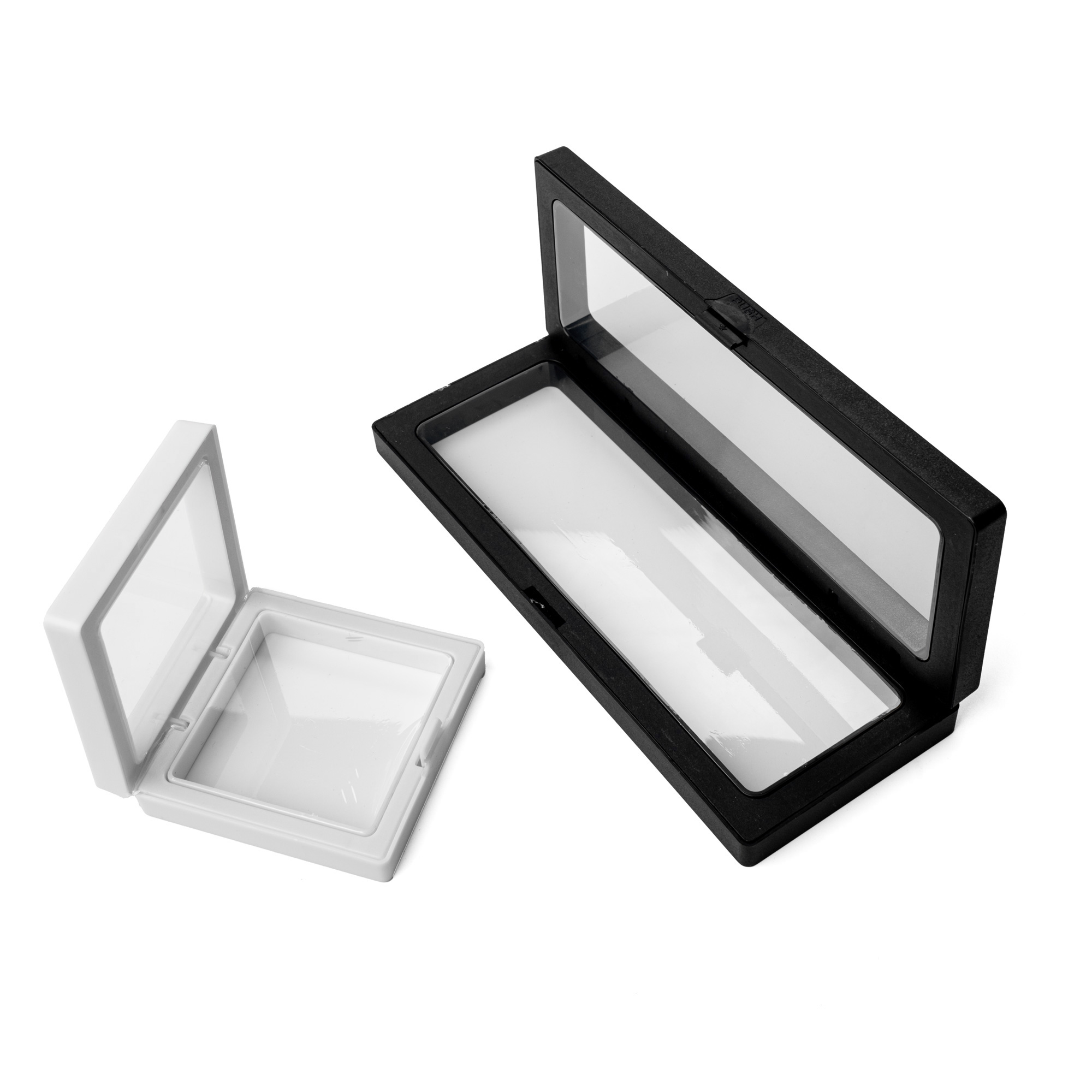Plastový rámik je sklopný a skladá sa z dvoch pevných polovíc - na každej je pripevnená pružná priehľadná silikónová membrána. Po otvorení vložíte predmet dovnútra a rámik zatvoríte. Membrány sa spoja, jemne objímajú predmet a pevne ho držia na mieste. Vďaka svojej mimoriadnej pružnosti sa môžu roztiahnuť až na približne 2 - 3 cm, takže sa do nich ľahko zmestia aj vyššie alebo objemnejšie predmety. Efekt "levitácie" a plná viditeľnosť zo všetkých strán sú stále zachované.