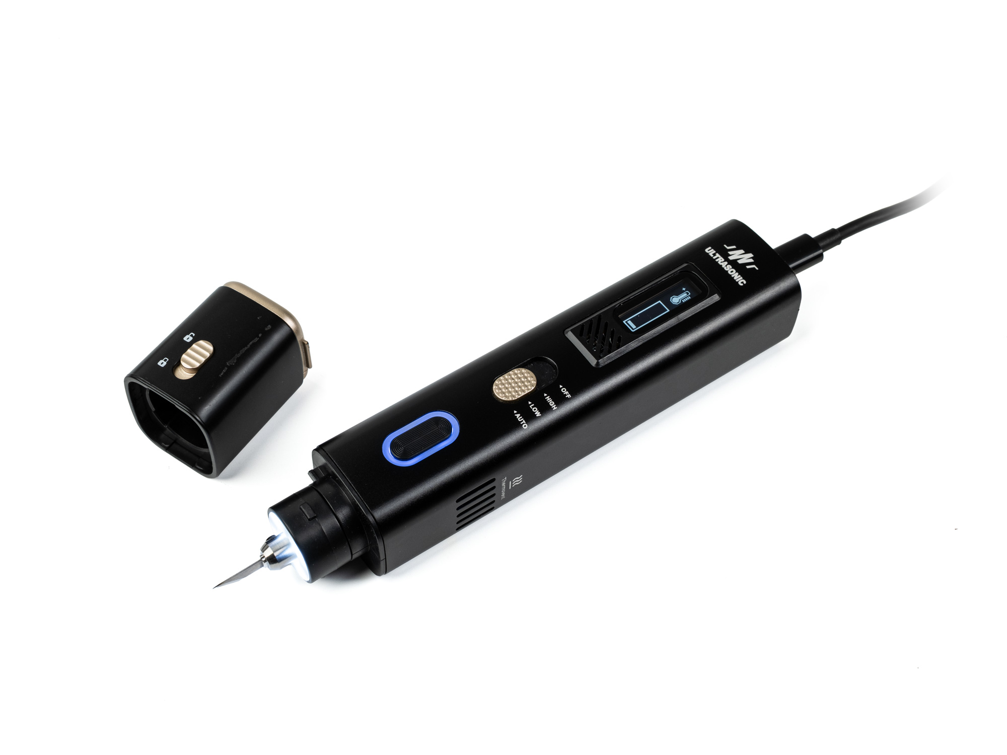ponúka tri režimy výkonu prevádzky - AUTO, LOW a HIGH, ktoré umožňujú zvoliť ideálnu silu ultrazvuku pre konkrétny typ materiálu. Režim AUTO aktivuje ultrazvuk automaticky pri kontakte s materiálom, čo uľahčuje plynulú prácu a znižuje zahrievanie nástroja. Režim LOW je určený na jemné rezy, presné obrábanie mäkkých materiálov a detailné 3D výtlačky. Naopak, režim HIGH poskytuje maximálny výkon na rýchle rezanie tvrdších plastov, silikónu, gumy alebo viacvrstvových materiálov, kde sa vyžaduje vyššia priepustnosť a účinnosť rezania.