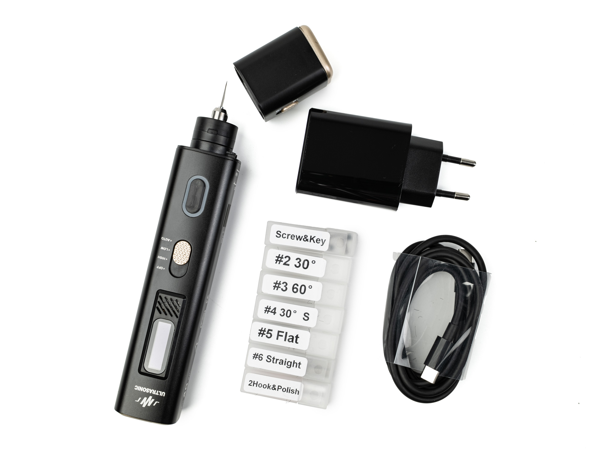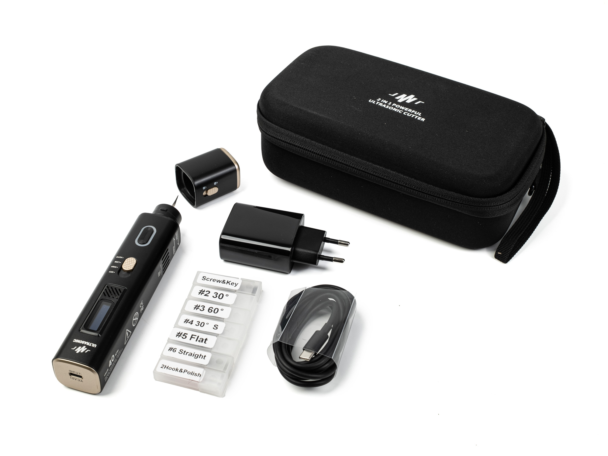 Balenie obsahuje: Ultrazvukový nôž 2v1, napájací adaptér USB-C, 30 W, kábel USB-C 1,5 m, čepele: 10x 4 mm skosené pod uhlom 60°, 10x 4 mm skosené pod uhlom 30°, 10x 2 mm skosené pod uhlom 30°, 10x 2 mm rovné, 10x 20 mm ploché, 1x leštiaci nástavec, 1x kliešte na leštenie nožov. 2x kliešte na čepeľ, 2x inbusový kľúč, 5x náhradný šnek na upevnenie čepele, puzdro na zips.