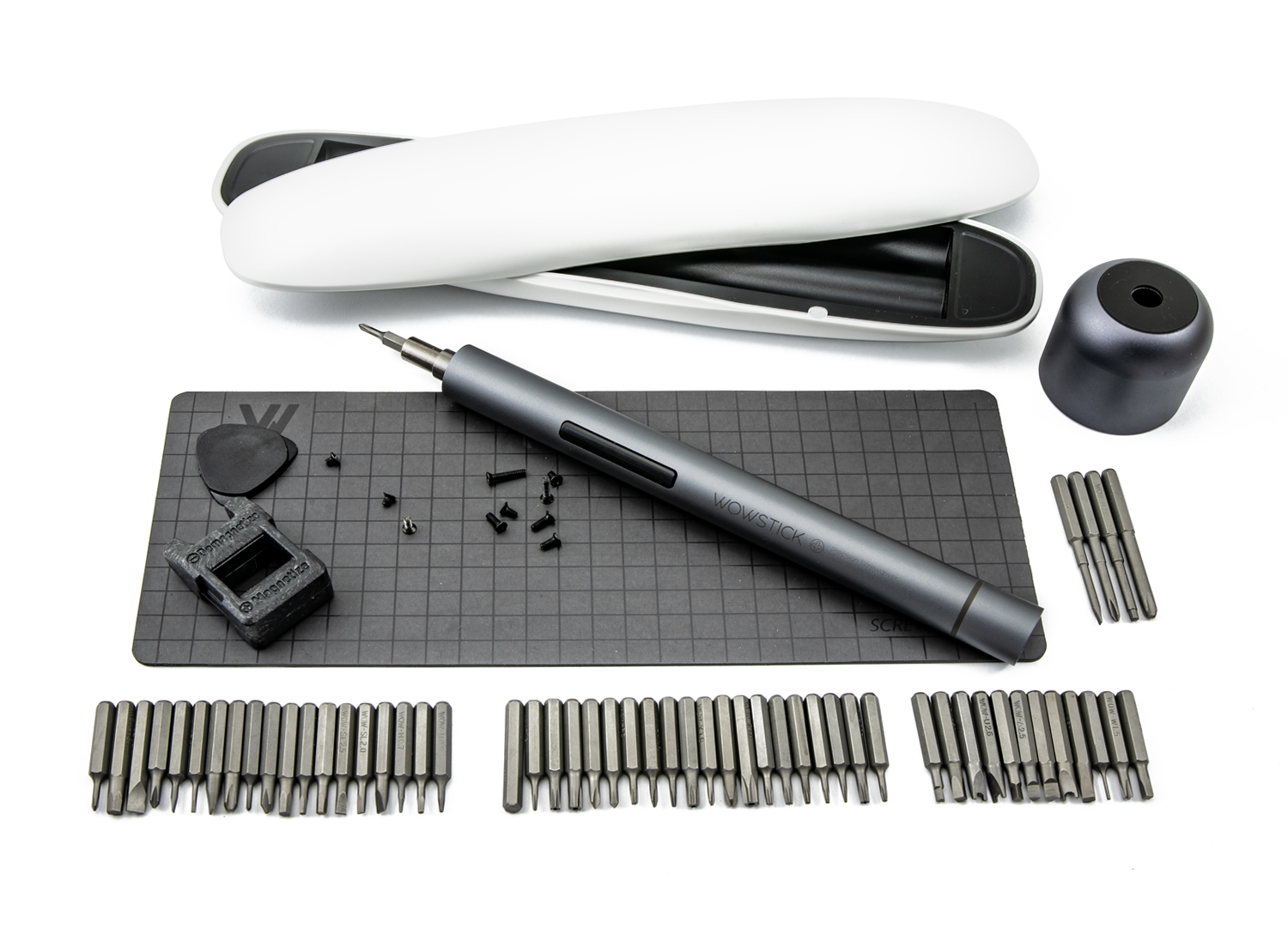 V balení okrem skrutkovača nájdete sadu precíznych 4mm bitov (56ks) pre servis mobilných telefónov, tabletov, fotoaparátov, navigácií, kamier, hodiniek a inej jemnej elektroniky, magnetizér / demagnetizér na skrutky, stojan pre mikro skrutkovač,