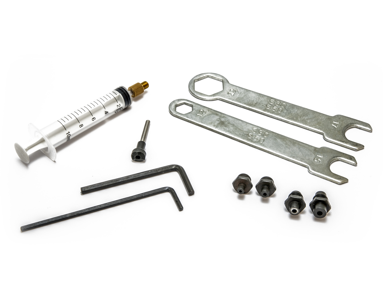 Obsah balenia: nitovačka SR-01, štyri nástavce pre rôzne veľkosti nitov, servisné kľúče a Imbusy, injekčná striekačka so závitom pre doplnenie hydraulického oleja.
