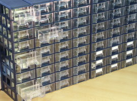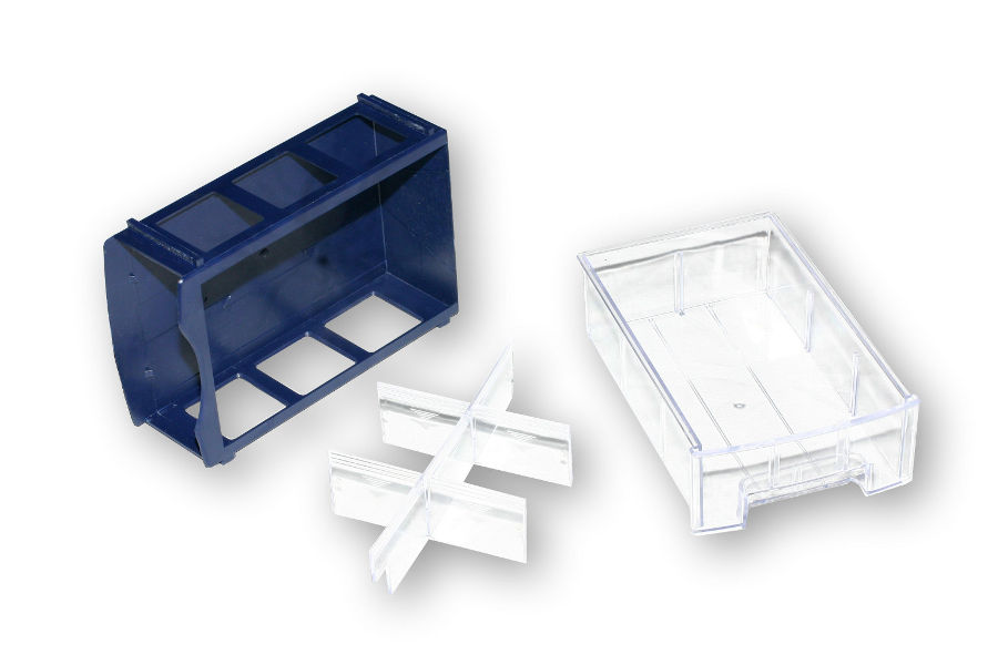 Plastové krabičky, ktorých skladaním si zostavíte skrinky na drobné súčiastky presne podľa vašich potrieb. Základným stavebným kameňom je plastová zásuvka s vychádzajúcou priehľadnou zásuvkou s vnútornými rozmermi 80 x 140 mm. Priestor zásuvky sa dá navyše oddeliť prepážkami, ktoré sú tiež priehľadné; štandardne sú v každej zásuvke dve prepážky. Na čelnej strane zásuvky sú vodiace lišty na zasunutie popisky.