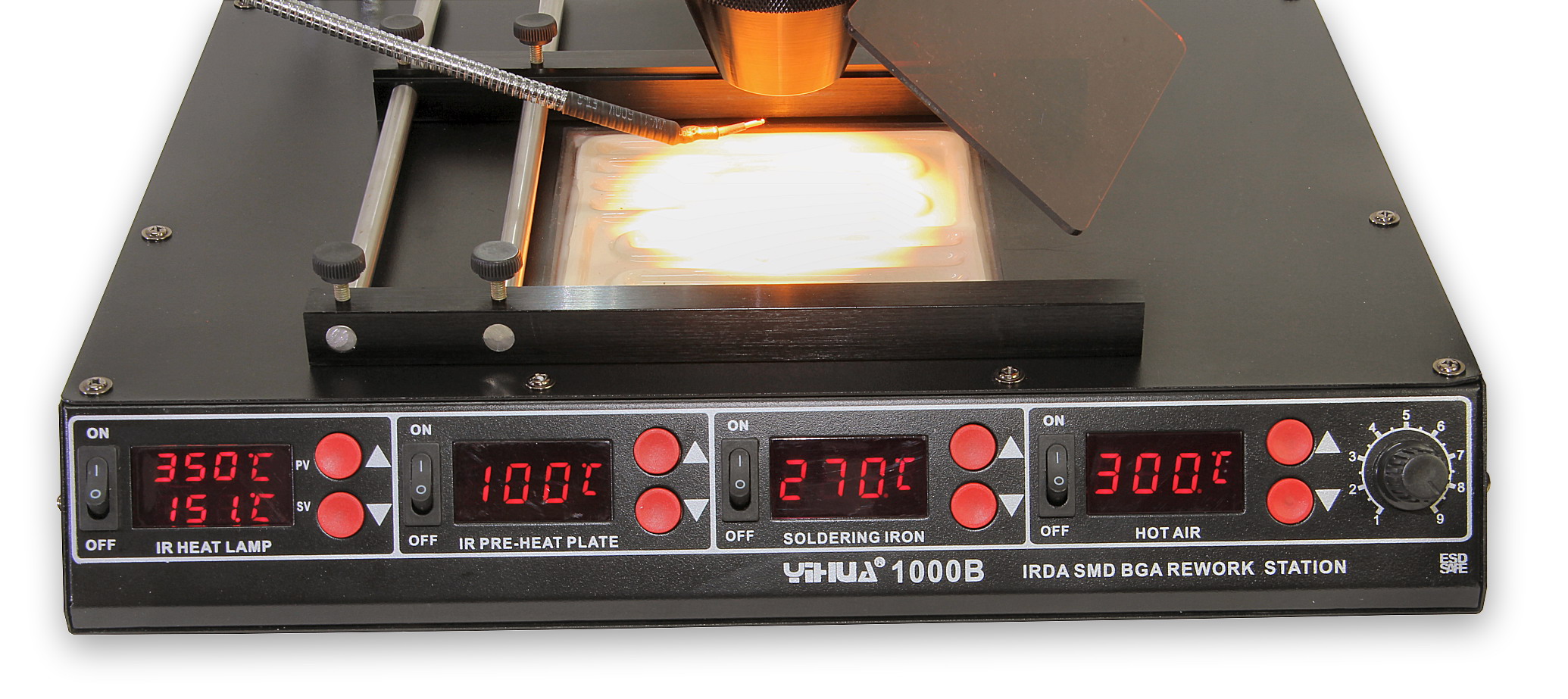 All-in-one systém Yihua 1000B ponúka všetko potrebné pre prácu s obvodmi SMT, špeciálne potom puzdrami BGA. Veľkým prínosom systému je riadenie výkonu iR žiariča podľa teploty povrchu čipu. K tomu je stanica vybavená snímačom teploty na husom krku, ktorý sa jednoducho priloží k päte spájkovaného čipu a poskytuje ako operátorovi, tak systému nutnú spätnú väzbu. Vďaka informáciu o teplote môže PID regulátor stabilizovať dosiahnutú teplotu v okolí sondy. Pre operátora je potom presným nasmerovaním v technologickom procese pretavenia. Na displeji je zobrazená požadovaná aj aktuálna teplota.