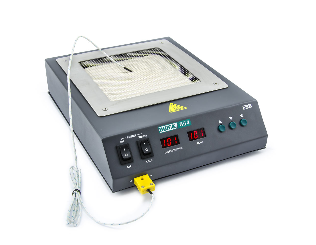 Infračervený keramický predohrev Quick 854 ESD s rýchlym nástupom teploty a plochou ohrevu o veľkosti 124x124mm. Vykurovacie teleso preheateru 854 má výkon 400W a jeho teplotu možno riadiť od 50 do 350 ° C s presnosťou +/- 8 ° C. Teplotná stabilita je 1 ° C. Teplota je spätno-väzobné riadená vďaka vnútornému termočlánku. Predohrev disponuje tiež externou termočlánkovou sondou typu K, ktorú možno umiestniť priamo na PCB pre presnú ručnú korekciu teploty požadovanej teploty. Podohrev disponuje aj funkciou rýchleho navolenia uloženej teploty. Systém PID kontrol zabezpečuje presnú a stabilnú teplotu.
