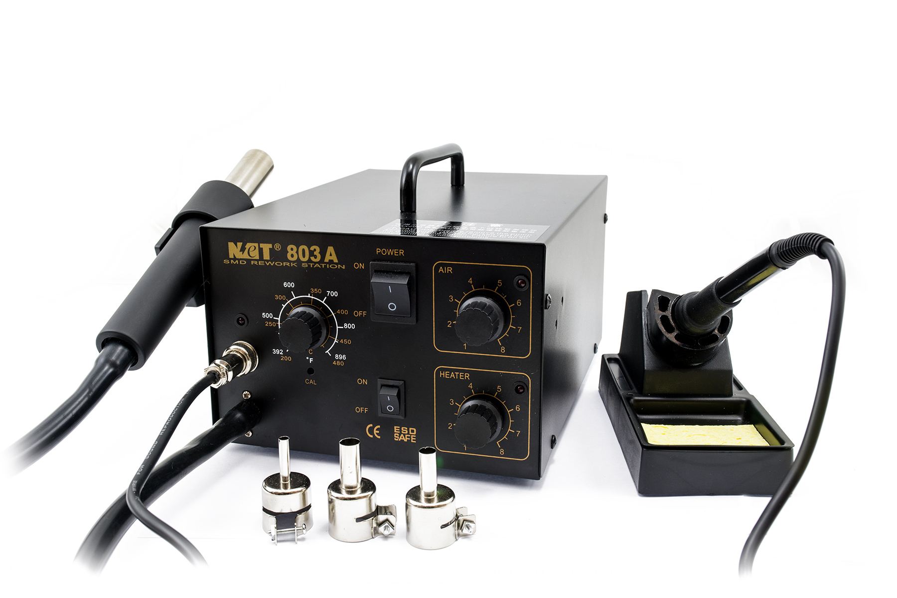 Indikácie chodu kompresora a ohrevu špirály sú indikované pomocou LED u patričných potenciometrov. Ústie horúcovzdušnej trubice dovoľuje osadenie všetkých dostupných typov horúcovzdušných nadstavcov z našej ponuky. Súčasťou dodávky je vybavenie na kompletné spájkovacie stanovište obsahujúce držiak pre spájkovacie pero s tŕňom pre cínovou špúli, špongiu a samozrejme mikrospájku so základným hrotom T-0.8D. K indikácii zahrievaniu / nahriatiu hrotu slúži LED na čelnom paneli. Teplota sa nastavuje potenciometrom voľbou hodnôt na stupnici v ° C.