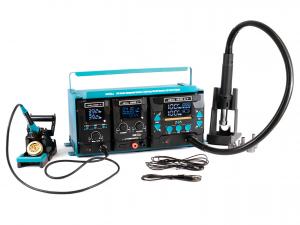 Pracovná stanica YIHUA 803 3v1 je kombináciou teplovzdušnej stanice, mikrospájky a regulovateľného zdroja s USB. Stanica sa skladá z troch samostatných modulov (teplovzdušná stanica, mikrospájka a napájací zdroj) moduly sú upevnené v kovovom ráme, možno ich ľahko vybrať a preskladať vedľa seba podľa potrieb a ergonómie užívateľa. V prípade potreby je možné ktorýkoľvek z modulov vytiahnuť a používať ho samostatne. Kovový rám je možné vďaka nožičkám v tvare L s otvormi pre skrutky napevno priskrutkovať k pracovnej doske. Stanica je vďaka svojej konštrukcii vhodná do školských dielní, servisných stredísk, alebo domov na pracovný stôl rádioamatéra. Kovový rám slúži zároveň ako podstavec pre notebook do veľkosti 16" a je možné naň zboku zavesiť bežný multimeter s vyklápacou opierkou. Celý systém je zložený z troch samostatných častí s vlastným napájaním a prívodným káblom upevnených v kovovom ráme. 1) Teplovzdušná stanica – YIHUA 993DM IV – slúži na bezkontaktné spájkovanie/odpájanie najmä viacerých vývodových SMD súčiastok, kedy sú cínované spoje nahrievané naraz horúcim vzduchom. Spájkovanie a odpájanie SMD súčiastok a integrovaných obvodov pomocou horúceho vzduchu je veľmi rýchly a šetrný spôsob práce pri opravách a vývoji el. zariadenie. Plne digitálna teplovzdušná stanica s príkonom až 1000W disponuje vzduchovým čerpadlom, ktoré cez gumovú hadicu tlačí vzduch do teplovzdušnej rúčky, kde dochádza k jeho ohrevu. Rýchlosť prúdenia 10-60l/min a teplota 100-500 ° C vzduchu z rúčky je možné pohodlne nastaviť pomocou tlačidiel po stranách modrého LCD displeja, ktorý zobrazuje všetky potrebné informácie. Pod displejom sa nachádza trojica okrúhlych tlačidiel, ktoré slúžia na rýchle nastavenie vami uložených teplôt. K stanici je dodávaný robustný odkladací stojan pre teplovzdušnú rúčku, ktorú je možné do stojanu umiestniť horizontálne aj vertikálne, rúčka sa pri položení do stojana automaticky vypína, vypnúť horúci vzduch je možné roveň manuálne a malým tlačidlom umiestneným na rukoväti rúčky. Na dýzu teplovzdušnej rúčky je možné nasadiť nástavce s priemerom 22mm, súčasťou balenia sú štyri okrúhle nástavce s priemerom 5,7,8 a 10mm, ktoré sú schopné pokryť väčšinu potrieb pri spájkovaní. Ďalšie dýzy napríklad štvorcové pre IO je možné dokúpiť TU na našom e-shope. 2) Mikrospájka YIHUA 939D+IV pre kontaktné olovnaté a bezolovnaté spájkovanie a odpájanie SMD či THT vývodových súčiastok a obvodov pomocou spájkovacieho pera s vymeniteľným hrotom s integrovanou spätnou väzbou pre presné riadenie nastavenej teploty. Kompaktná spájkovacia digitálna stanica s príkonom až 120W a veľmi presným nastavením teploty 200-480°C disponuje spájkovacím perom K917 ktoré je kompatibilné s hrotmi rady 900-T. Pre plynulú reguláciu teploty slúži veľký otočný volič pod displejom modrým LCD displejom, ktorý zobrazuje všetky potrebné parametre. Okrem ovládania teploty sa na čele stanice nahádžu tri okrúhle tlačidlá, ktoré slúžia na rýchle vyvolanie vopred nastavených teplôt potrebných pri spájkovaní. Stanica je vybavená detekciou pri nečinnosti a po 10 minútach kedy je pero odložené, dochádza k vypnutiu ohrevu, táto funkcia má za následok predĺženie životnosti pera a hrotu ale taktiež znižuje riziko požiaru v prípade, že zabudnete vypnúť stanicu po ukončení práce. So stanicou je dodávaný odkladací stojan pre pero s držiakom na cievku cínu, 1mm hrot a špongie na čistenie hrotu. 3) Napájací zdroj s USB YIHUA 3005D IV 150W je jednosmerný napájací zdroj 0-30V / 5A, s výkonom až 150W. Tento je vhodný na napájanie elektrických zariadení a obvodov v školských laboratóriách, vývojových centrách či opravárenských strediskách. Plne digitálny jednosmerný spínaný zdroj disponuje presnou a plynulou reguláciou napätia v rozsahu 0-30V s rozlíšením 0,1V s presnosťou 0,1% +0,01V a nastavením prúdu v rozsahu 0-5A s rozlíšením 0,1A a presnosťou 0,2% +3mA. Pre pripojenie vodičov k výstupu laboratórneho zdroja sú v prednej časti umiestnené skrutkovacie svorky na uchytenie vidličky a otvory pre 4mm banániky. Zdroj je vybavený modrým LCD displejom, ktorý zobrazuje nastavené hodnoty V/A. Zdroj dokáže pracovať v dvoch režimoch CC (Constant Current) CV (Constant Voltage) a je vybavený ochrannou proti preťaženiu a skratu. Okrem výstupných svoriek sa na prednom paneli nachádza aj USB konektor s výkonom až 20W s výstupným napätím DC 5V/9V/12V±0,2V, ktorý je schopný dodať prúd 4A/2,5A/2A podľa výstupného napätia. USB je kompatibilný s protokolmi quick charge 2.0 a 3.0. Hmotnosť celej zostavy je 9kg, rozmery zostavy v ráme. 210x200x410mm DxVxŠ - šírka je uvedená vrátane nožičiek po stranách   Obsah balenia: Teplovzdušná stanica - YIHUA 993DM IV, Mikrospájka YIHUA 939D+IV, YIHUA 3005D IV, kovový rám, napájacie káble 3x1m.
